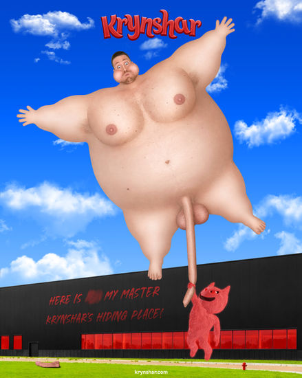 Mid-jump, Little Mist decides to jump on Adolf's big belly and spins towards it with a “Wooooow!” But Adolf's big bouncy belly sends Little Mist hurtling higher and further than he had expected. He falls face down on the ground, while Adolf's body, in response to the impact, slowly bounces away in the opposite direction, the man moaning each time his inflated body hits the ground.